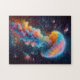 Cette image surréaliste présente une méduse vibrante flottant dans un espace cosmique. La cloche translucide de la méduse présente dans des teintes vives de bleu, rose, orange et jaune, avec ses tentacules derrière dans une formation nuageuse de couleurs similaires. Autour de la méduse se trouvent des corps célestes, y compris des planètes et des étoiles, qui donnent l'impression de dériver dans l'espace. Cette oeuvre fusionne magnifiquement la vie marine et l'espace extra-atmosphérique, donnant lieu à une pièce visuellement frappante et imaginative.