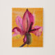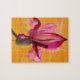 De la peinture originale aquarelle de Sacha Grossel d'une fleur d'aquarelle violette sur un pop art orange vif peint arrière - plan. Ce design animé s'inspire des climats tropicaux et fleuris et est un style botanique et pop art.