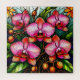 Vitrail coloré avec orchidées roses fleuries au feuillage vert, présentant un design tropical et artistique avec des détails complexes et des couleurs vives, incarnant la beauté, la nature et l'élégance intemporelle dans l'expression artistique.
