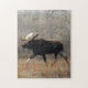 Puzzle de l'orignal mâle. Un orignal mâle se fraie un chemin à travers les broussailles dans une zone de collines de sable dans le sud-est de l'Alberta, au Canada. Les orignaux semblent déplacés dans ce terrain sec et sablonneux qui contient très peu d'eau pour soutenir la végétation aquatique dont les orignaux se nourrissent habituellement.