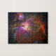 This space photograph shows the massive Orion Nebula, and was taken by the Hubble Space Telescope. The Orion Nebula is the birthplace of many new stars, and over 3000 stars are present in this image, surrounded by swirling clouds of gas and dust. The colours of the original photo have been enhanced slightly, and include rich oranges, pinks and purples.