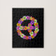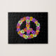 Ce puzzle boho jigsaw présente un signe de paix floral dans les tons rose, jaune, orange, violet, vert, blanc et noir.