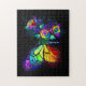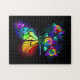 Papillon monarque peint artistiquement de manière lumineuse et arc-en-ciel avec bouquet de roses iridescentes, brillantes et luminescentes sur fond noir. Papillon arc-en-ciel.