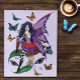 Jolie fée aux cheveux noirs tout en violet et rouge assis sur un champignon dans un fond de violet