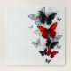 Un troupeau de papillons de morpho volants, réalistes, rouges et noirs sur un arrière - plan blanc avec des gouttes de peinture.