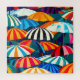 Une représentation joyeuse de jours ensoleillés et de détente balnéaire avec des parasols rayés colorés.
