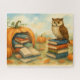 L'aquarelle illustrant une vibe d'octobre fantaisiste d'un patch citrouille avec un citrouille géant avec des livres qui débordent et une chouette perchée sur une pile de manuels à côté. tout autour sont de petits citrouilles et des feuilles d'automne.