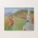 Ce puzzle unique présente une peinture de Marjorie Tietjen. On peut imaginer survoler l'église et la campagne dans un rêve.