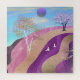 Ce magnifique paysage abstrait dépeint un paysage vallonné avec des arbres printaniers en fleurs et des oiseaux dans les tons rose, violet, beige, tan, or, vert et bleu.