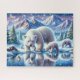 Un ours polaire mère et ses deux petits se tiennent près d'un bassin d'eau calme dans un paysage enneigé et montagneux. La piscine reflète leurs images. Deux petits oiseaux se tiennent sur la rive enneigée, et un autre vole au loin. Des arbres à feuillage persistant couverts de neige parsèment l'arrière - plan. La scène est baignée par la lumière bleue et rose d'un coucher de soleil hivernal.