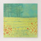 Un paysage moderne et contemporain avec une paisible prairie fleurie remplie d'oiseaux volant contre le ciel et une forêt de pins au loin. Couleurs jaunes et vertes fraîches et relevantes. Art original de Nic Squirrell.