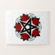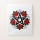 Pentagramme noir avec motif, décoré de fleurs, roses rouges avec feuilles sur arrière - plan blanc. Style tatouage.