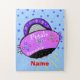 Caractère de dessin animé de Petals Spacship sur un arrière - plan bleu clair. Personnalisez avec le nom de l'enfant en rouge. Joli navire rose et violet avec yeux bleus et visage souriant. S'envolant dans la galaxie des étoiles bleues. Dessin original Dessin de personnage de dessin © 2014 TamiraZDesigns.