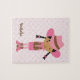 Le puzzle personnalisé présente une belle illustration vectorielle d'une petite cow-girl sur un arrière - plan motif rose. Personnalisez avec le nom de votre petite fille, monogramme, initiales ou texte de votre choix pour un cadeau unique. Cocoa Studio.