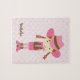 Le puzzle personnalisé présente une belle illustration vectorielle d'une petite cow-girl sur un arrière - plan motif rose.