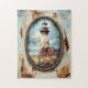 Cette oeuvre dnumériquementart présente un phare rouge et blanc classique encadré dans une bordure de corde ovale, dressé contre un arrière - plan à texture bleue et rouille patinée. Le thème nautique et le design vintage en font un lieu de séjour idéal pour les amateurs de décoration côtière et maritime.
