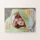 Photo et fiche de naissance de votre enfant sur un mignon puzzle avec un mignon arbre à grains de bois et un oiseau orange assis dans une branche tourbillonnant avec des feuilles correspondants.
