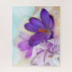 Un puzzle avec une belle photo d'un crocus violet foncé serti dans un pot en verre. Une légère fleur violette est présente dans l'arrière - plan.