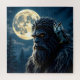 Art acrylique de Bigfoot. Un Sasquatch aux yeux dorés avec un hibou sur son épaule avec un arrière - plan de forêt Pleine lune dans les tons bleus.