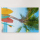 Cette décoration est faite de planches de surf colorées debout dans le sable avec un palmier, une plage et l'océan en arrière - plan. #puzzle #puzzles #surf #surfer #fun #cool #beach #tropical #sport #relax #surfing #games #cadeaux #stockingstuffers #secrétariat #noël