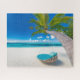 Cette photo Getty Images extraordinaire présente un paysage tropical avec balançoire ou hamac et sable blanc et mer calme.