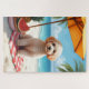 An elegant Poodle enjoying a calm beach setting with tropical fruits and soft ocean views. The painterly style creates a refined and cheerful coastal atmosphere.