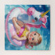 A cute young girl gently drifts on a pink and white unicorn float, gliding across a crystal-clear, blue swimming pool.