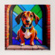 Un beagle joyeux est assis sur un seuil de pierre, encadré par une fenêtre en vitrail aux couleurs vives. Des couleurs audacieuses et des formes géométriques créent une scène ludique et artistique idéale pour les thèmes de l'animal de compagnie, de l'art ou de la décoration intérieure.