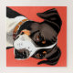 Illustration stylisée d'un chien noir et blanc en vue de profil, avec fond rouge vif mettant l'accent sur la silhouette élégante du chien tout en mettant en valeur son charme.