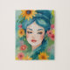 Ce design dynamique et fantaisiste présente un portrait abstrait d'une femme aux cheveux bleus turquoises ornés de fleurs colorées. Son expression sereine est accentuée par les yeux fermés et les lèvres rouges, lui donnant un aspect onirique. Elle est entourée de tournesols vibrants, de fleurs roses et d'un éventail de feuillages verts, créant une atmosphère luxuriante et de jardin. La pièce a un style doux et vectoriel, qui lui donne une sensation moderne mais romantique. La palette de couleurs est dominée par les teals, les jaunes, les roses et les verts, créant une composition harmonieuse et attrayante.