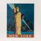 Affiche de voyage vintage pour New York, montrant la Statue de la Liberté avec des bateaux, skyline, et projecteur au loin la nuit, vers 1927.