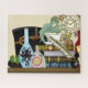 Green dragon in a tea cup that is on a pile of books. Top a, elixirs, a feather pen with inkwell and a clock with gears showing are all around the dragon.