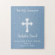 Célébrez le jalon spécial d'une première communion sainte avec ce don. Sur fond de bleu poussiéreux doux, une croix complexe aux rayons délicats qui s'échappent vers l'extérieur symbolise la grâce divine de ce jour significatif. La typographie moderne en blanc pur présente élégamment les mots "Première Sainte Communion" à côté du nom personnalisable, reflétant la pureté et l'innocence de l'occasion. Cela fait un cadeau parfait personnalisé pour un garçon spécial sur sa première communion sainte !