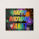 Cette conception amusante, excitante, sur le thème de l'anniversaire, de puzzle comprend le message "HAPPY BANTHDAY, JANET" avec un motif dégradé coloré inspiré du spectre arc-en-ciel, et un feu d'artifice festif animé inspiré des motifs arrière - plans. Un puzzle aussi excitant pourrait être utilisé pour envoyer un message d'anniversaire à quelqu'un du nom de Janet. [~Z0000465]
