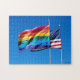Un puzzle vibrant avec un drapeau de la Pride arc-en-ciel clignotant et un drapeau américain, dressé contre un ciel bleu parfait. Célébration d'une Amérique accueillante et diversifiée. Photographié à Cherry Grove sur Fire Island. Partie de la collection Pride.