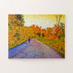 Une femme se promène sur une route bordée d'arbres en flammes de feuillage d'automne sur ce magnifique puzzle.