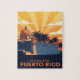 A retro style illustration of El Morro fortress in San Juan, Puerto Rico, under a vibrant sunset sky.