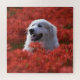 Adorable Grande Pyrénées dans un champ de fleurs rouges