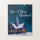 Ce graphique en couches, représente une église violette recouverte de neige, abrupte, aux fenêtres lumineuses, sur une dérive de neige, avec de grands arbres dans l'arrière - plan-contre un ciel étoilé, bleu foncé et vert, mélangé ensemble, affichant un accueil de vacances familier. Cette scène nous rappelle à tous, pourquoi nous célébrons un temps si joyeux et si saint, avec nos proches, en cette période de l'année !