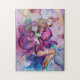 Clown rose, coloré, capricieux, drôle jouant du bugle avec un hibou expressif et des notes musicales joyeuses, fleurs, feuilles en rouge vif, fuchsia, violet, violet, bleu, couleurs blanches, aquarelle de Bulgan Lumini (c)