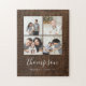 Puzzle imprimé sur mesure personnalisé avec vos photos de famille et monogramme sur un arrière - plan en bois de fausse grange. Ajoutez votre nom de famille monogramme ou autre texte personnalisé avec espace pour 4 photos Instagram carrés. Utilisez les outils de conception pour ajouter d'autres photos et modifier les polices de texte et les couleurs pour créer une conception unique d'un genre. Les puzzles photo personnalisés font un grand cadeau pour la famille et les amis!