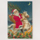 Vintage illustration of Santa Claus on a white wooden horse, carrying a Christmas tree with colorful baubles and a basket full of toys under a clear blue night sky with a bright shining moon and stars on a cold winters night.