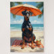 Un Doberman confiant profitant d'un cadre de plage raffiné sous un parasol élégant avec des fruits tropicaux et une vue sur l'océan. Le détail pictural crée une atmosphère côtière audacieuse et haut de gamme.
