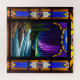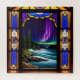 Vitrail artistique présentant une aurore animée au-dessus d'un paysage de baie océanique entouré de nature.