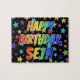 Ce puzzle animé et amusant sur le thème de l'anniversaire comprend le message "HAPPY BANTHDAY, SETH" avec les personnages ayant un spectre arc-en-ciel coloré inspiré motif dégradé, en plus d'un passionnant motif arrière - plan de champ étoile. Un puzzle aussi excitant pourrait être une façon amusante de reconnaître l'anniversaire de quelqu'un du nom de Seth. [~Z0000468]