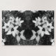 A black and white floral composition created from mirrored blossoms, forming a calm and slightly surreal pattern. Soft petals and dark centers create a hypnotic, balanced image that feels both peaceful and mysterious