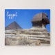 Le Grand Sphinx et la Grande Pyramide de Gizeh, Egypte. Le Grand Sphinx de Gizeh (ou, communément, le Sphinx) est une statue d'un sphinx couchant ou incliné (une créature mythique au corps de lion et à la tête humaine) qui se dresse sur le Plateau de Gizeh, sur la rive ouest du Nil à Gizeh, en Egypte. Il s'agit de la plus grande statue monolithe du monde, mesurant 73,5 mètres de long, 6 mètres de large et 20,22 mètres de haut. Il s'agit de la plus ancienne sculpture monumentale connue, et est communément considéré comme ayant été construit par les anciens Egyptiens de l'Ancien Royaume dans le règne du pharaon Khafra (c. 2558-2532 av. J.-C).