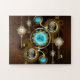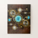Turquoise lenses with antique watch with brass gears and golden keys on rusty, brown background. Steampunk style.