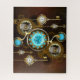Turquoise lenses with antique watch with brass gears and golden keys on rusty, brown background. Steampunk style.