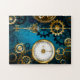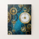 Turquoise, textured, steampunk background with brass and gold gears, a silver key and the clock. Steampunk style.
